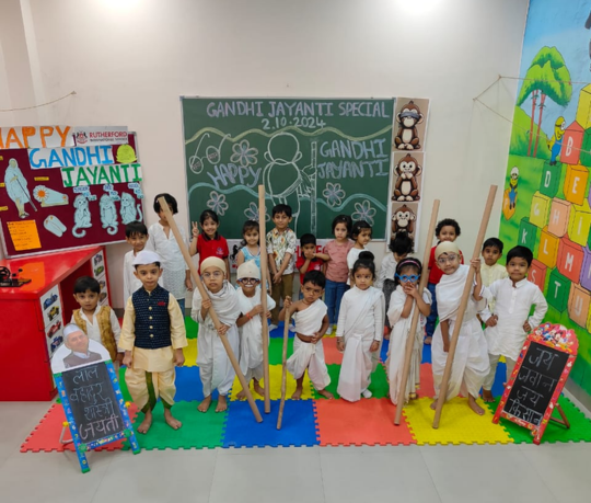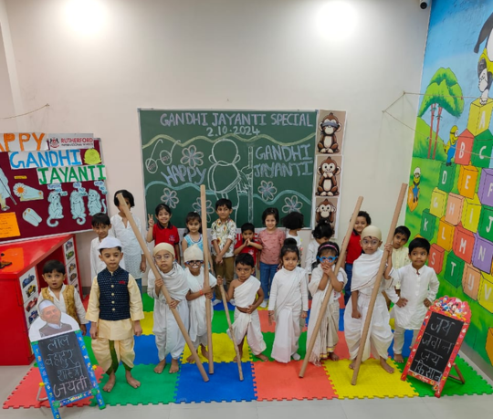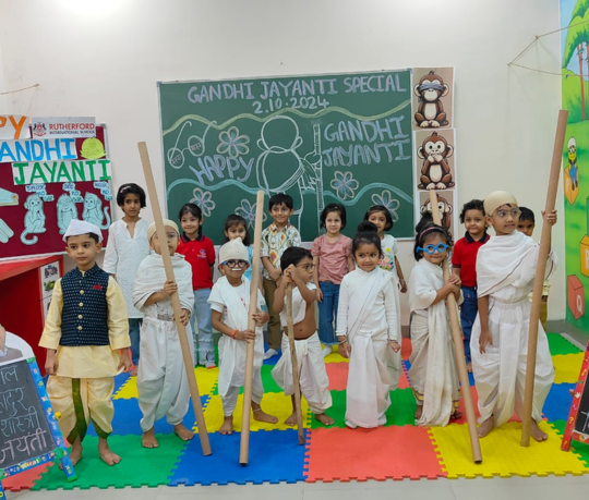 Our school celebrated Gandhi Jayanti with great respect and admiration for the Father of the Nation, Mahatma Gandhi. The event began with a heartfelt tribute at the Gandhi statue 🌺, followed by the singing of bhajans like “Raghupati Raghav Raja Ram” 🎵, spreading peace and harmony.